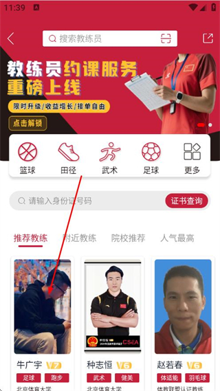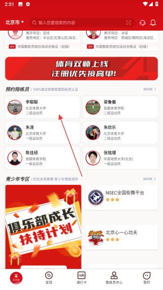 2、在首頁繼續(xù)下滑,能看到更多教練員展示,還有青少年專區(qū)等特色板塊,按需選擇,比如想為青少年找教練,就點擊青少年專區(qū),獲取更精準服務(wù)。