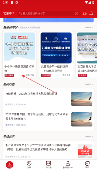 3、在首頁找到教練員培訓區(qū)域,這里有中小學體質(zhì)健康測評指導師、兒童青少年體能訓練師等課程介紹,點擊查看詳情,了解培訓內(nèi)容、報名方式等信息。