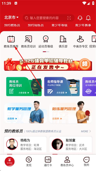 1、打開體教聯(lián)盟APP,在首頁點擊教練員推薦選項。