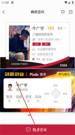 3、可查看教練的詳細信息,點擊我要咨詢即可進一步溝通。