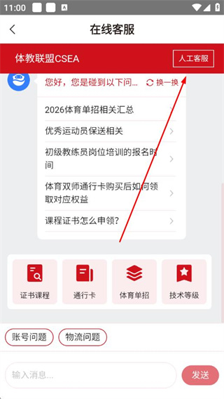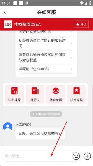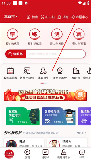 1、打開體教聯(lián)盟APP,點擊頂部的客服中心選項,進入在線客服頁面。