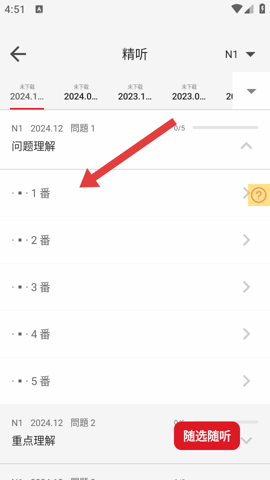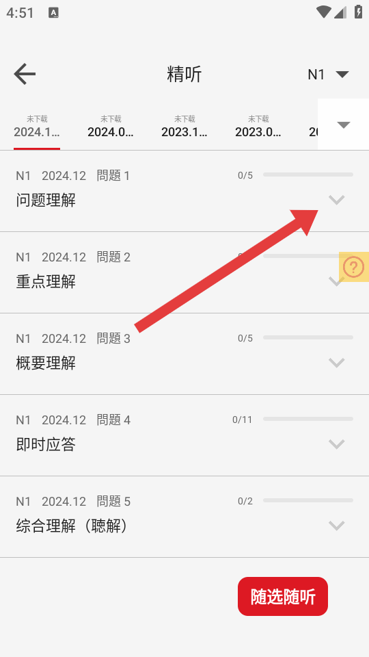 2、在精聽題目列表頁面,選擇要下載音頻的聽力題目,點(diǎn)擊展開箭頭。