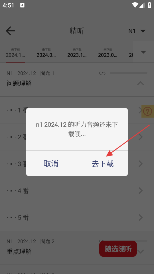 3、展開題目后,選擇具體的音頻條目,觸發(fā)音頻下載的提示。