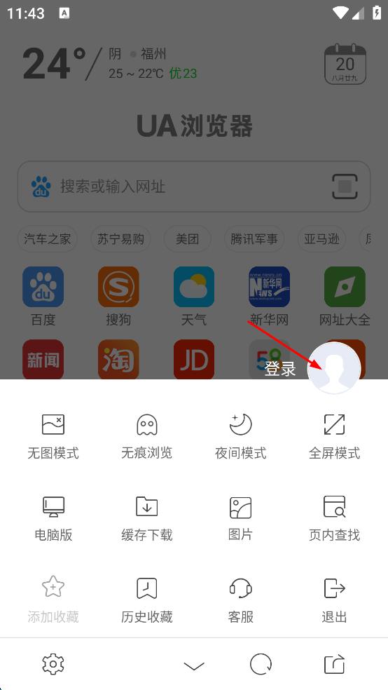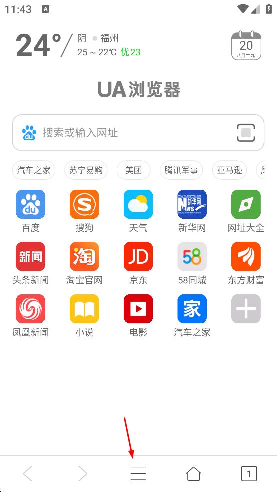 1、打開UA瀏覽器,點擊頁面底部中間的菜單圖標,彈出功能菜單。