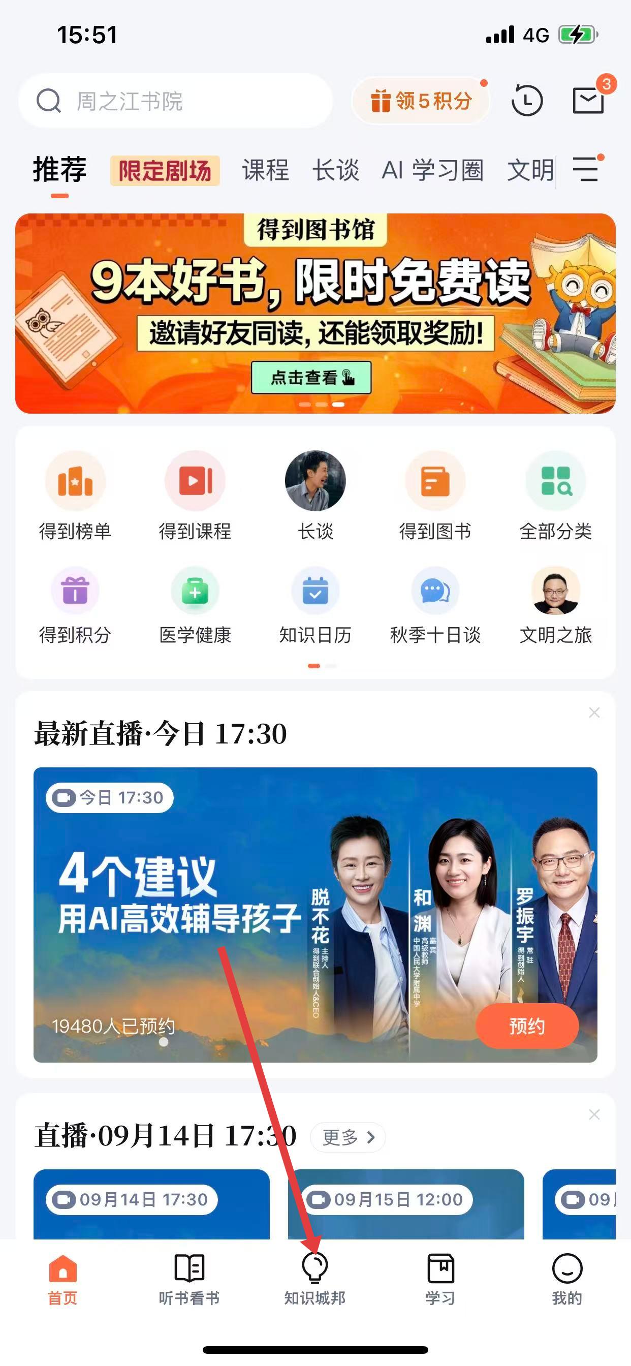 1、打開得到App,點擊底部導航欄中的知識城邦圖標。