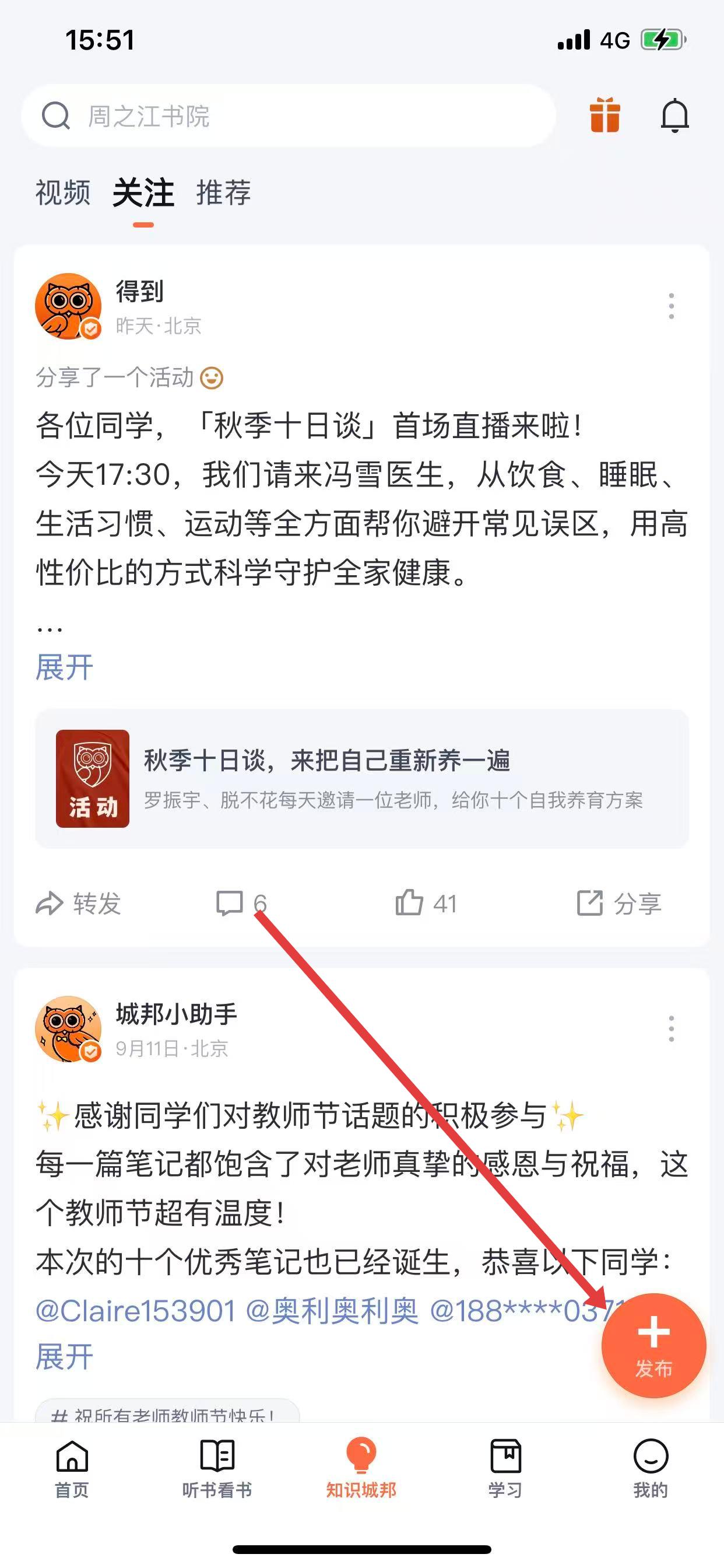 2、進入“知識城邦”頁面后,點擊右下角的+發(fā)布按鈕。
