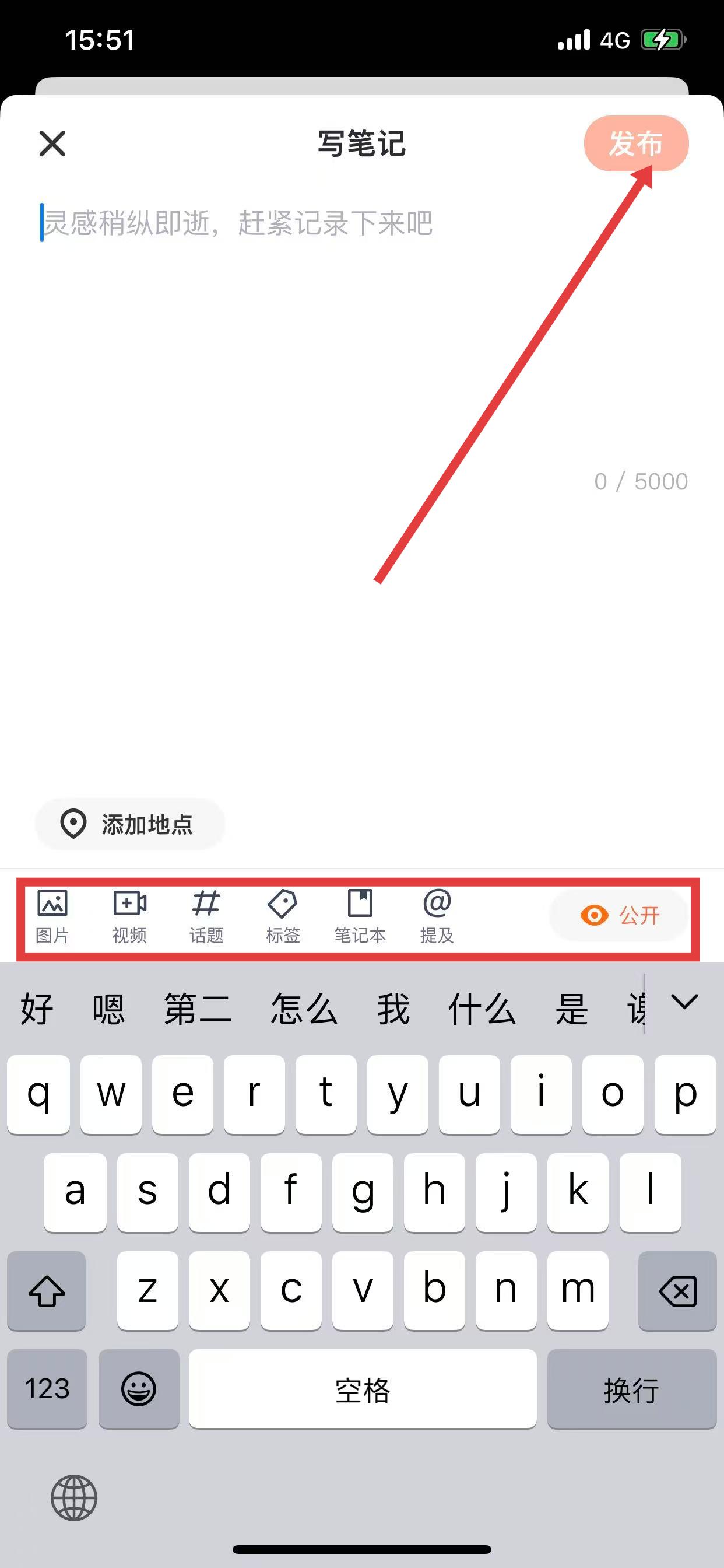 3、輸入想要發(fā)布的動態(tài)內(nèi)容 ,添加圖片、視頻,帶上話題、標簽,選擇筆記本分類、設(shè)置公開或私密狀態(tài)等,點擊發(fā)布按鈕。