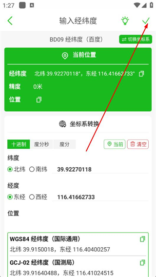 5、在輸入經(jīng)緯度頁面,輸入或選擇經(jīng)緯度后,點(diǎn)擊對勾圖標(biāo)。