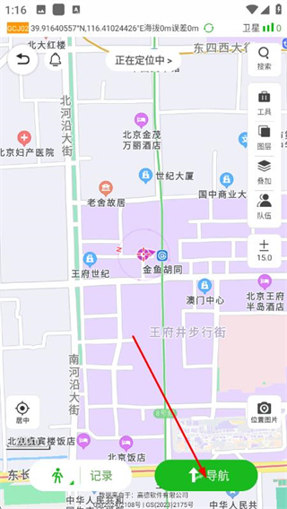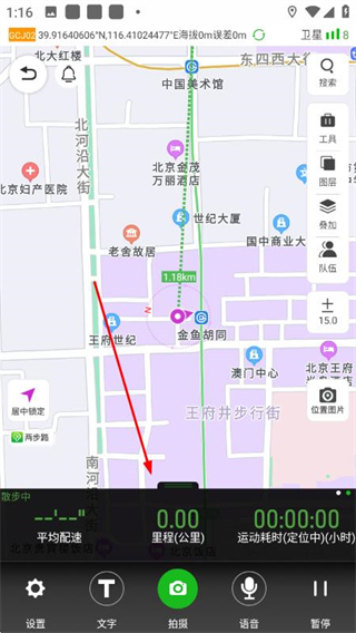 5、開(kāi)始導(dǎo)航后,可查看里程、運(yùn)動(dòng)耗時(shí)等實(shí)時(shí)數(shù)據(jù),利用右側(cè)工具、圖層、隊(duì)伍等功能輔助出行。