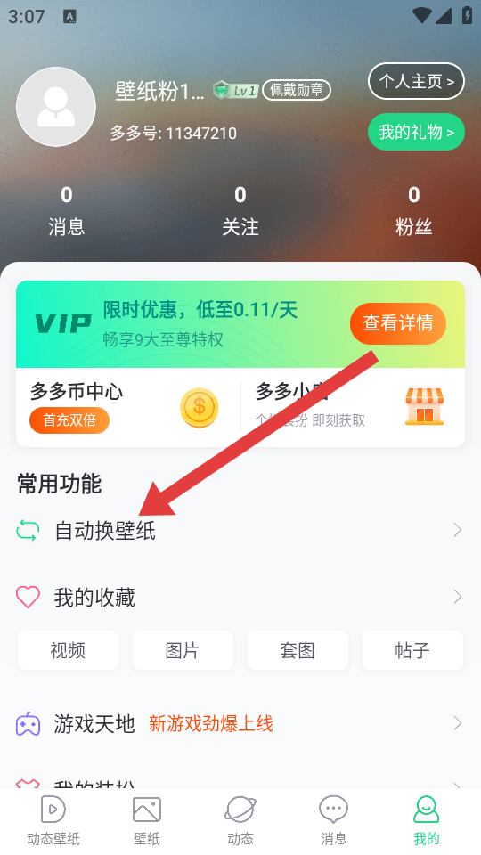 2、在我的頁面中,找到自動換壁紙的選項并點擊,進(jìn)入自動換壁紙設(shè)置的頁面。
