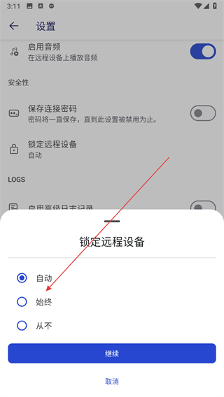 3、在鎖定遠(yuǎn)程設(shè)備的選擇窗口中,找到始終選項(xiàng)并點(diǎn)擊選中該選項(xiàng)。