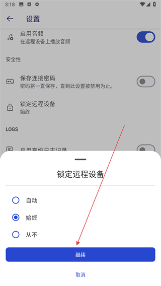 4、選中始終選項(xiàng)后,點(diǎn)擊繼續(xù)按鈕,即可完成始終鎖定遠(yuǎn)程設(shè)備的設(shè)置。