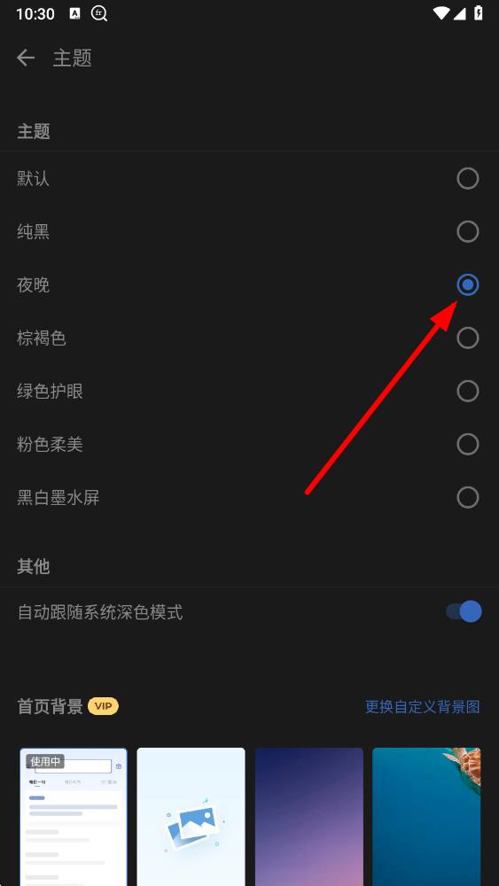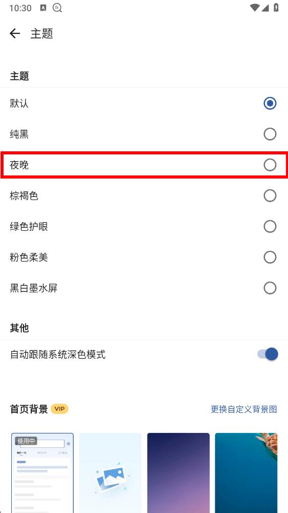 3、在主題設(shè)置頁面的主題列表中,找到夜晚選項(xiàng)。