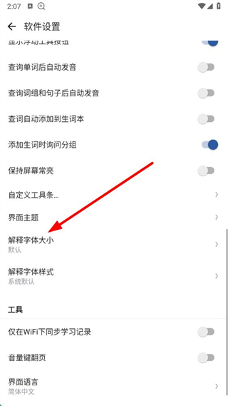 3、在軟件設(shè)置界面,點(diǎn)擊解釋字體大小選項(xiàng),進(jìn)入字體大小選擇界面。