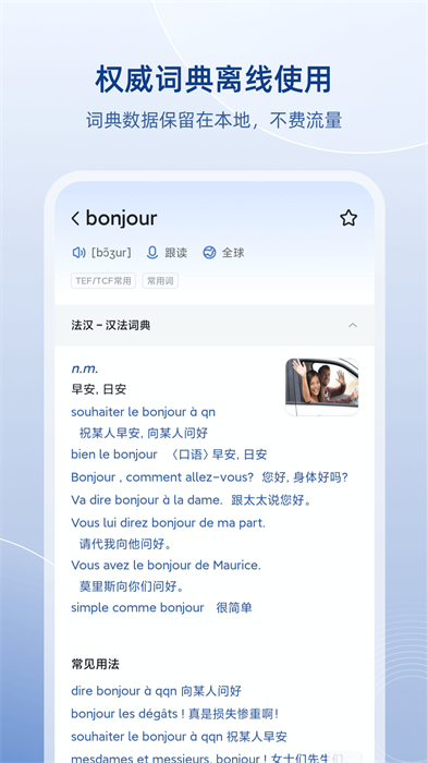擁有與桌面版相同容量的詞庫。包括了法漢漢法詞典、法語近義詞詞典、法語專業(yè)詞典以及法法、法英等大量詞庫;