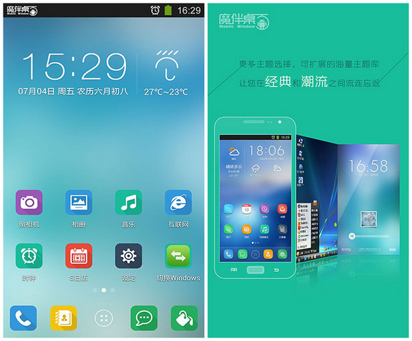 魔伴桌面是一款將安卓設(shè)備(智能手機(jī)、智能平板、智能電視)完美變身為Windows的神奇軟件,可以切換為Windows7、Vista和XP風(fēng)格的顯示界面,軟件還完美模擬了我的電腦、Internet Explorer等Windows特性,并且可以設(shè)置動(dòng)態(tài)壁紙和整點(diǎn)報(bào)時(shí)鈴聲,提供了天氣預(yù)報(bào)、社區(qū)、聊天和同聲傳譯(英文翻譯、聊天機(jī)器人)等功能。