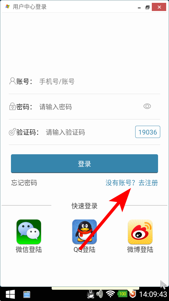 2、在彈出的用戶(hù)中心登錄窗口中,點(diǎn)擊沒(méi)有賬號(hào)?去注冊(cè)選項(xiàng)。