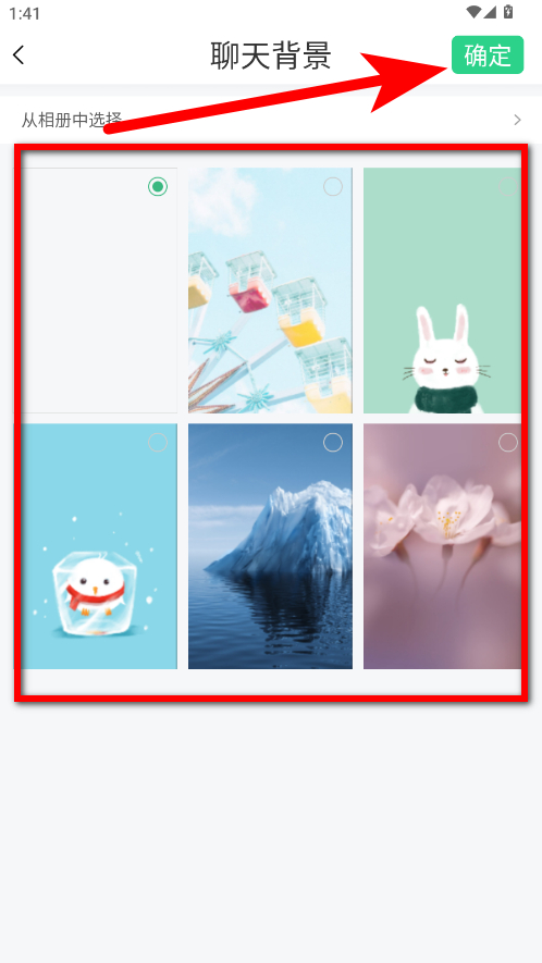 4、在聊天背景頁(yè)面,選擇喜歡的背景圖片,點(diǎn)擊右上角確定即可完成設(shè)置。