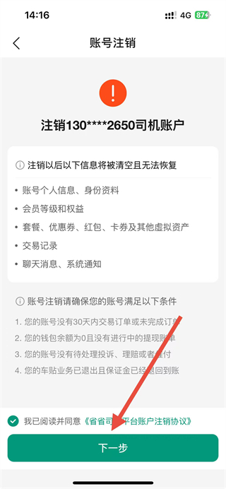 4、在賬號(hào)注銷頁面閱讀并同意相關(guān)協(xié)議后點(diǎn)擊下一步按鈕,完成賬號(hào)注銷流程。