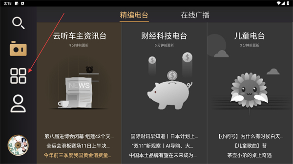 1、打開聽伴fm的應(yīng)用,進(jìn)入時(shí)點(diǎn)擊左側(cè)的功能圖標(biāo)。