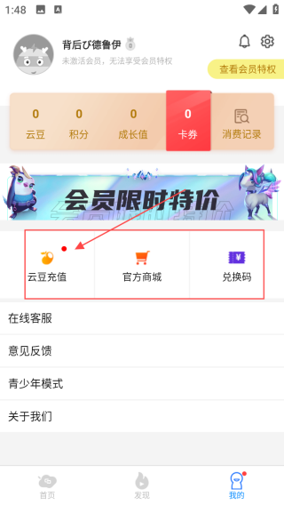 3、點(diǎn)擊我的進(jìn)入個(gè)人中心,如果需要充值獲取更多游戲權(quán)益,點(diǎn)擊云豆充值進(jìn)行云豆充值操作,若想購(gòu)買(mǎi)周邊等商品,點(diǎn)擊商城,有兌換碼時(shí)點(diǎn)擊兌換碼輸入兌換碼獲取對(duì)應(yīng)獎(jiǎng)勵(lì)。