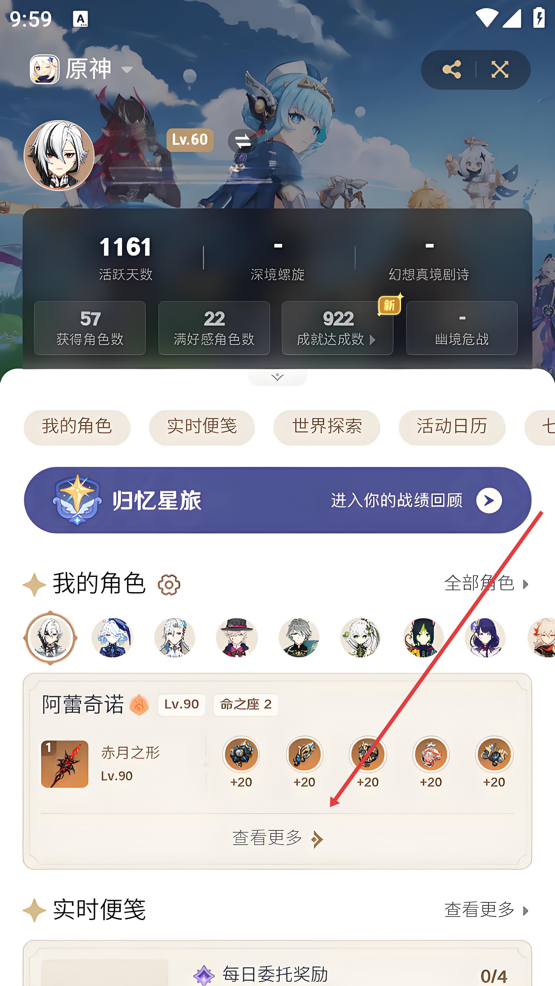 2、點擊游戲角色卡片,進入角色數(shù)據(jù)概覽頁,可以查看活躍天數(shù)、獲得角色數(shù)等基礎(chǔ)信息,這里點擊查看更多。