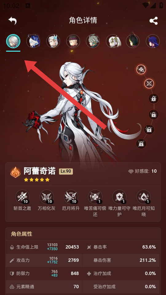 3、在角色數(shù)據(jù)頁點擊具體角色如阿蕾奇諾,進入角色詳情頁,查看角色等級、命之座、屬性面板等詳細信息。