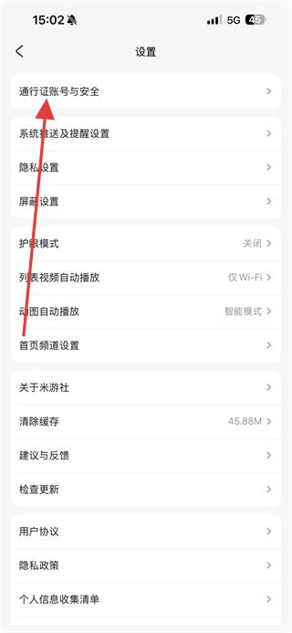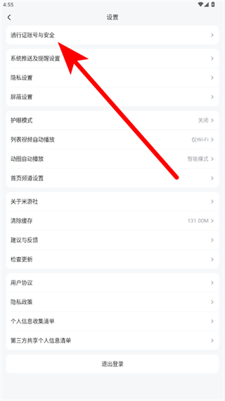 3、進入設(shè)置頁面后,點擊通行證賬號與安全選項。