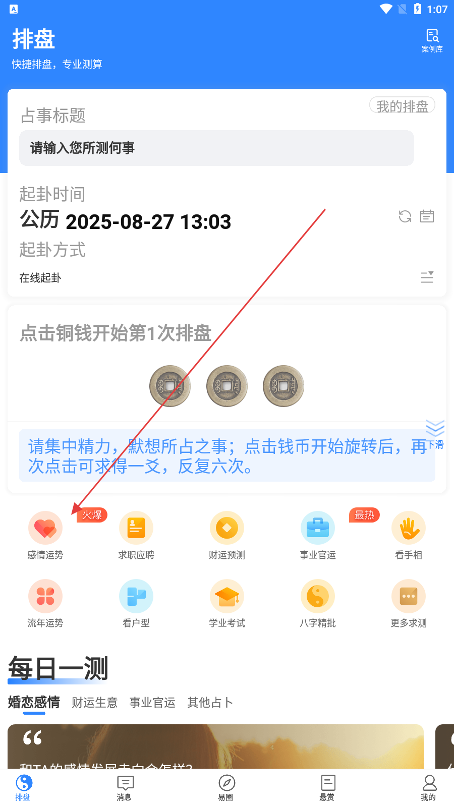 1、打開(kāi)天機(jī)六爻排盤(pán)軟件進(jìn)入排盤(pán)主界面,在下方列表里面招到感情運(yùn)勢(shì),點(diǎn)擊進(jìn)入。
