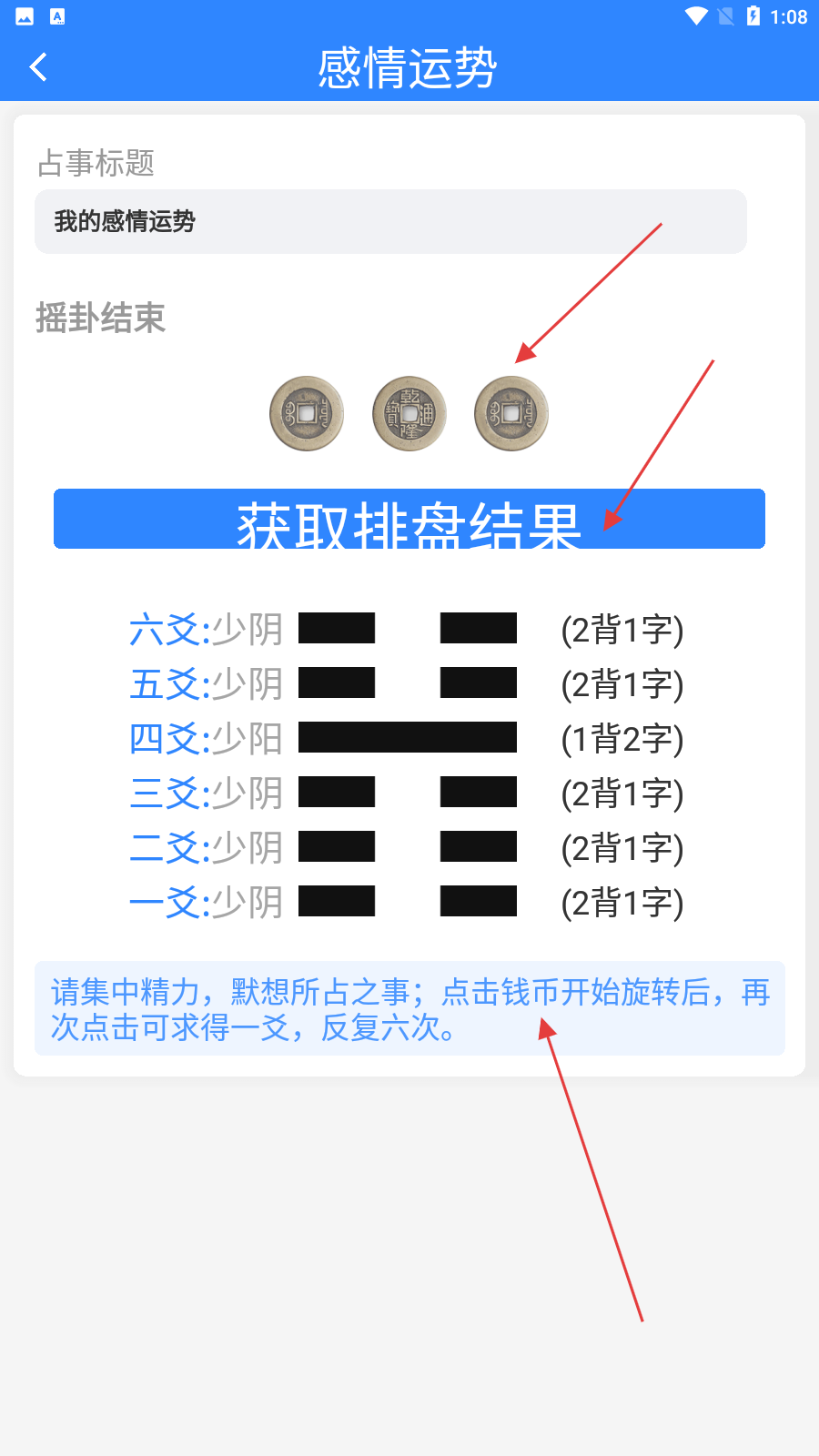 2、進(jìn)入感情運(yùn)勢(shì)搖卦頁(yè)面后,默想自己所關(guān)心的感情相關(guān)事宜,點(diǎn)擊頁(yè)面中的銅錢(qián)圖標(biāo),銅錢(qián)開(kāi)始旋轉(zhuǎn),待其停止后再次點(diǎn)擊銅錢(qián)獲取一爻,按照此步驟反復(fù)操作六次。