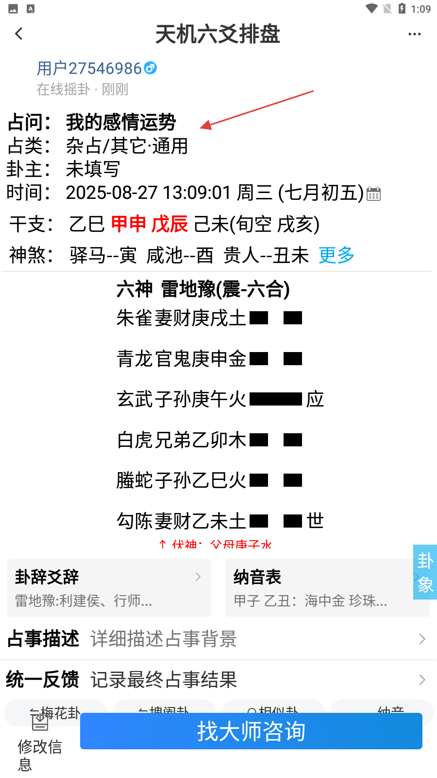 3、點(diǎn)擊獲取排盤(pán)結(jié)果后進(jìn)入天機(jī)六爻排盤(pán)結(jié)果頁(yè)面,查看占問(wèn)內(nèi)容是否與自己輸入的一致,仔細(xì)研讀六神、卦象等信息,了解當(dāng)前感情運(yùn)勢(shì)狀態(tài)。