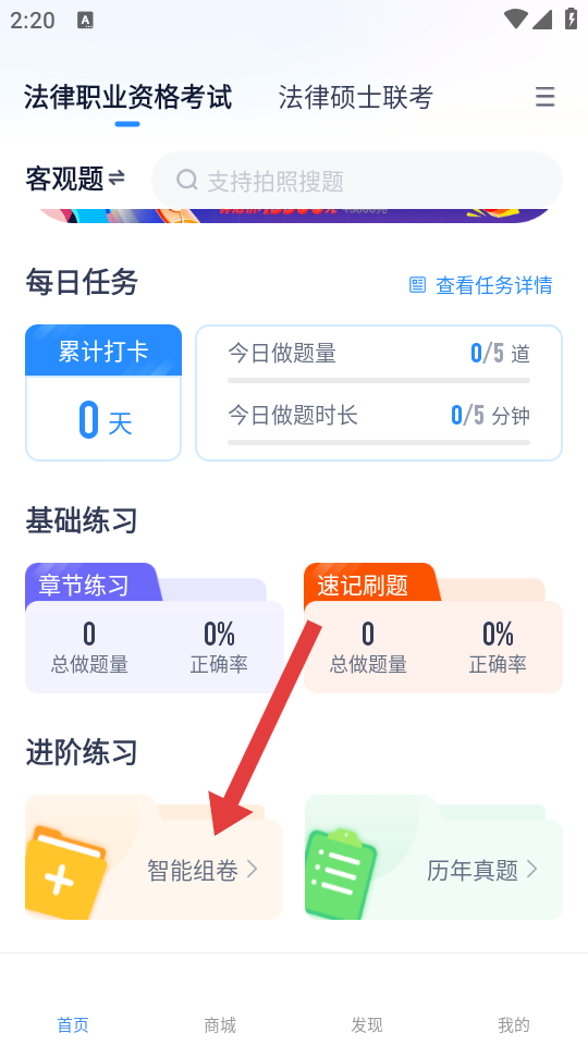 1、在首頁進階練習板塊,點擊智能組卷,進入試卷分類選擇頁面。