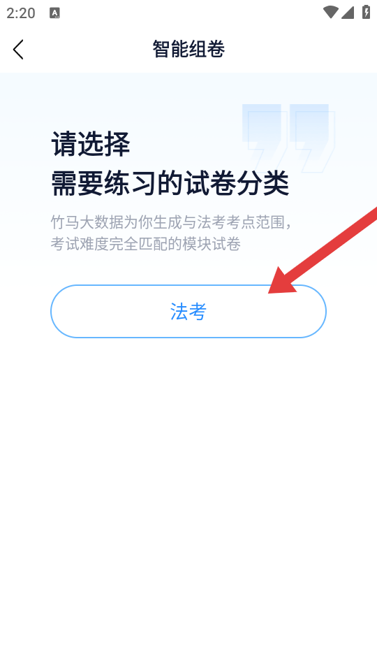 2、在智能組卷的頁面,需要點擊法考,進入卷別分類選擇的環(huán)節(jié)。