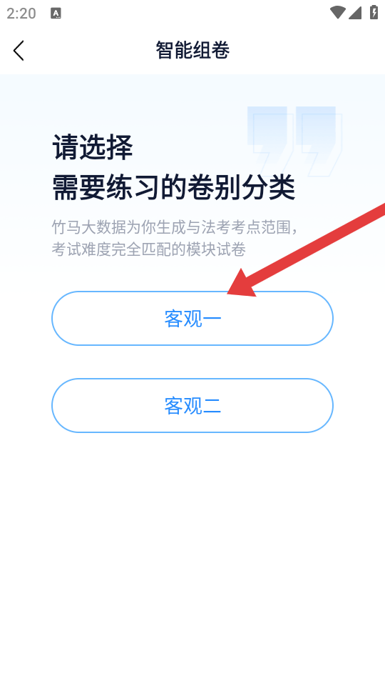 3、在卷別分類選擇頁面,點擊客觀一,生成對應(yīng)的法考模塊試卷。