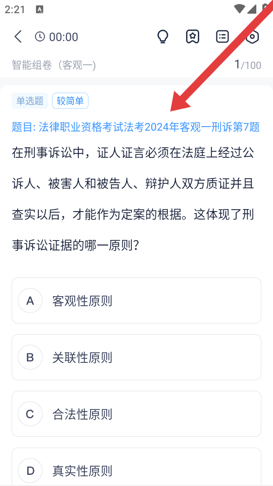 4、進入智能組卷做題界面后,即可開始刷題,如解答2024年客觀一刑訴題目。