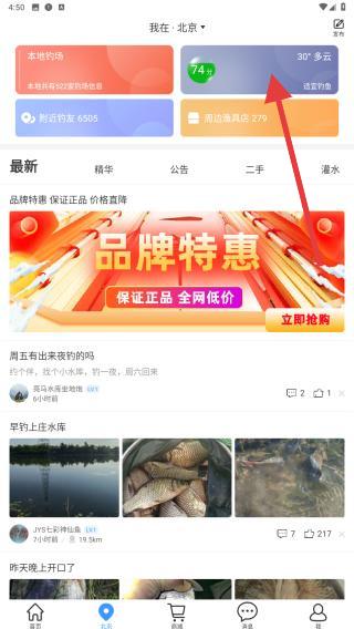 1、首頁導(dǎo)航觸發(fā):打開釣魚人APP,在首頁頂部導(dǎo)航欄,點(diǎn)擊本地的圖標(biāo),進(jìn)入當(dāng)前地區(qū)所在的頁面。