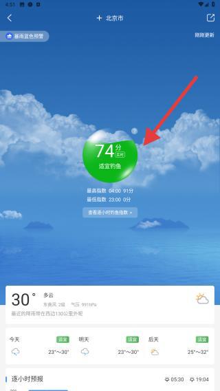 2、在本地頁面的頂部,需要找到顯示溫度、天氣狀況+釣魚指數(shù)的模塊,點(diǎn)擊該區(qū)域進(jìn)入詳情頁。