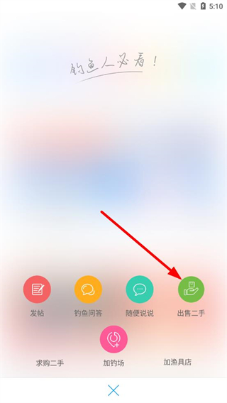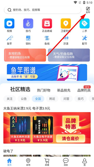 1、在釣魚人app首頁點(diǎn)擊右上角發(fā)布按鈕,進(jìn)入發(fā)布選項頁面。