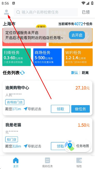 回答:①選定想要拍攝的任務(wù),②選擇“找到了(室外門店)”或者“找到了(室內(nèi)門店)”,③點(diǎn)擊相機(jī)按鈕,拍攝營(yíng)業(yè)場(chǎng)所的清晰照片(照片上要有任務(wù)的完整名稱)。