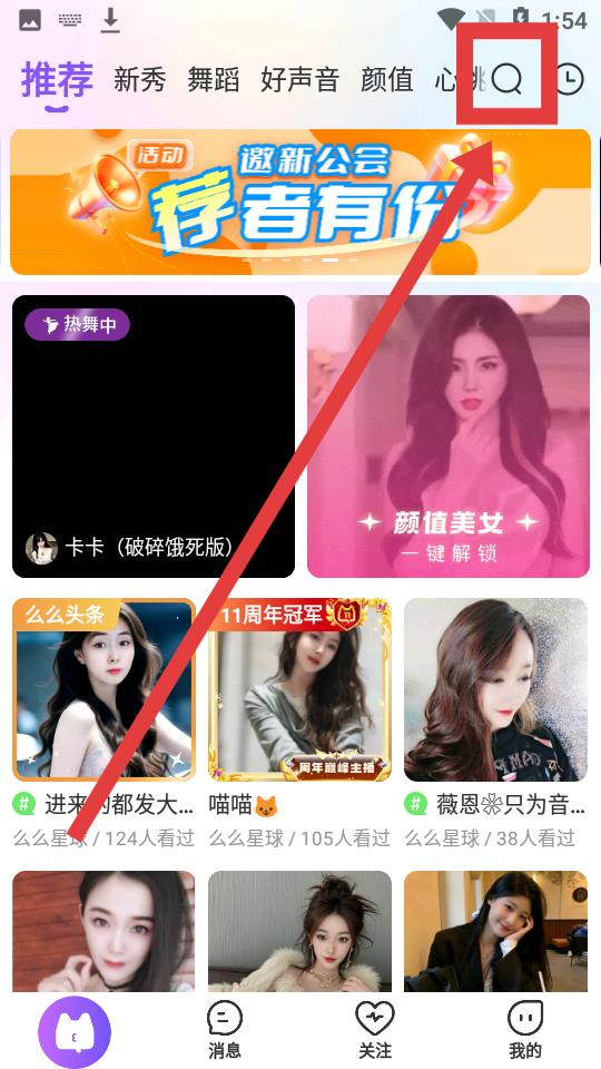 2、在首頁界面的右上角,找到并點擊放大鏡搜索圖標,即可進入信息搜索頁面。