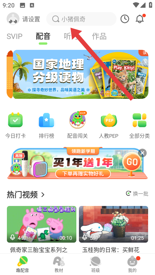 1、打開少兒趣配音APP,進(jìn)入配音的頁面,點(diǎn)擊頂部的搜索框。
