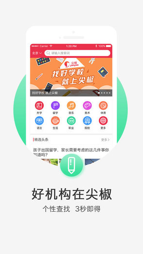 尖椒是中國(guó)專(zhuān)業(yè)的教育機(jī)構(gòu)點(diǎn)評(píng)與資訊服務(wù)平臺(tái),通過(guò)豐富的數(shù)據(jù)采集以及海量的用戶生產(chǎn)內(nèi)容,為用戶提供教育機(jī)構(gòu)的全方面點(diǎn)評(píng)信息以及個(gè)性化教育資訊,全力營(yíng)建一個(gè)客觀、公正、第三方的教育服務(wù)點(diǎn)評(píng)資訊系統(tǒng),讓教育產(chǎn)業(yè)變得更加透明、平等和高效。