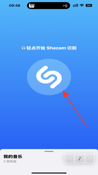 2、點(diǎn)擊后彈出識(shí)別的頁(yè)面,識(shí)別前手機(jī)需要額外播放歌曲,再輕點(diǎn)開始Shazam識(shí)別的按鈕。