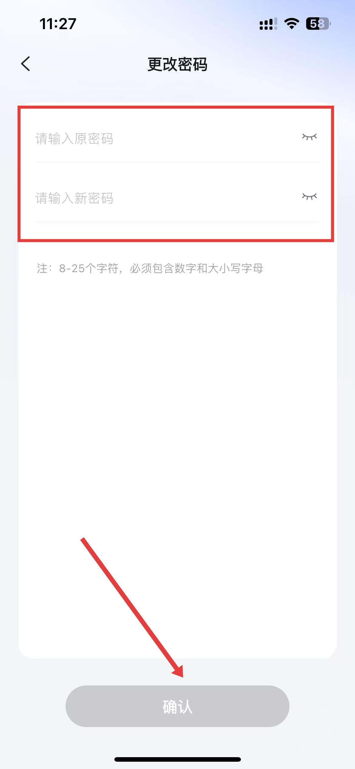 4、在更改密碼頁(yè)面,按要求輸入原密碼和新密碼,輸入完成后點(diǎn)擊確認(rèn)即可。