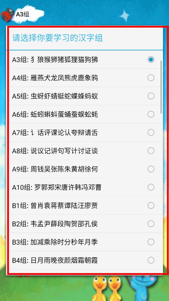 4、點(diǎn)擊后里面有眾多選項(xiàng),選擇想要學(xué)習(xí)的漢字組即可開始學(xué)習(xí)。
