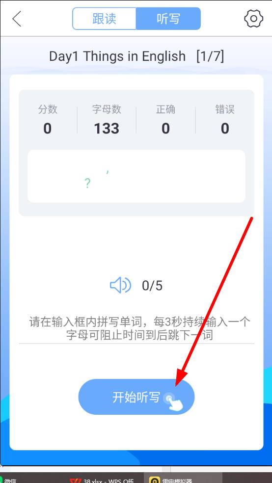3、進(jìn)入聽寫界面后,確認(rèn)準(zhǔn)備就緒,點(diǎn)擊開始聽寫按鈕,按照聽到的內(nèi)容在輸入框中拼寫單詞完成聽寫練習(xí)。