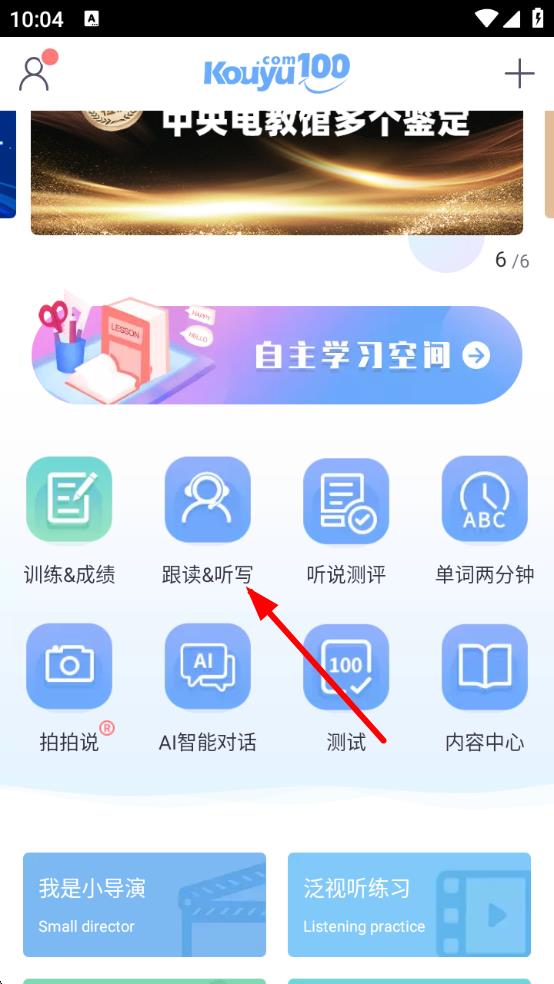 1、打開口語100APP,在首頁點(diǎn)擊跟讀&聽寫選項(xiàng),進(jìn)入跟讀與聽寫練習(xí)界面。
