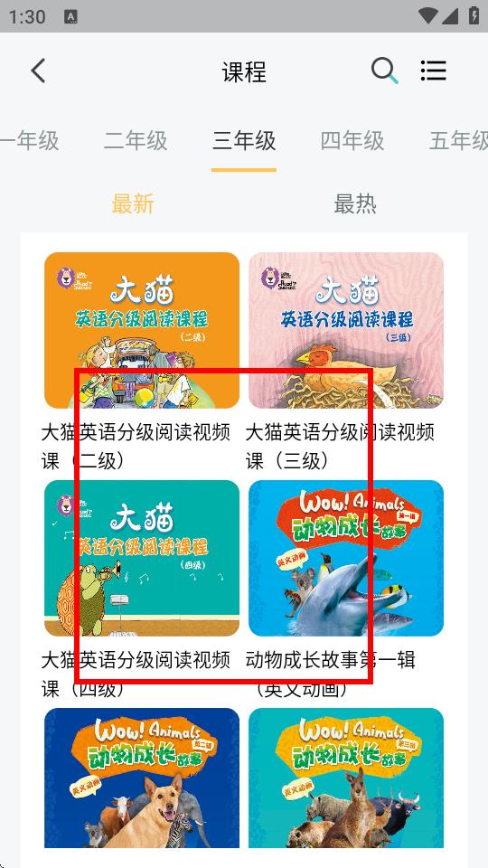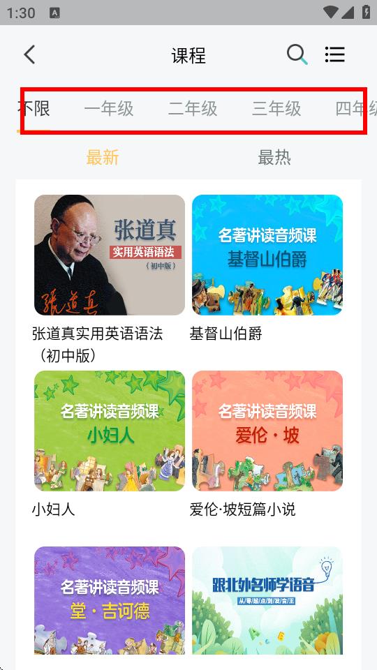 3、在課程頁面上方,會顯示年級分類標(biāo)簽,比如一年級、二年級等,點(diǎn)擊對應(yīng)的年級標(biāo)簽,即可篩選出該年級的課程。