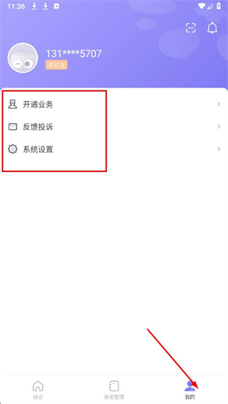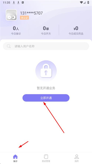 1、在我的頁面點擊開通業(yè)務,在接診頁面開展接診、開方等業(yè)務,查看今日接診人數(shù)等數(shù)據(jù)。