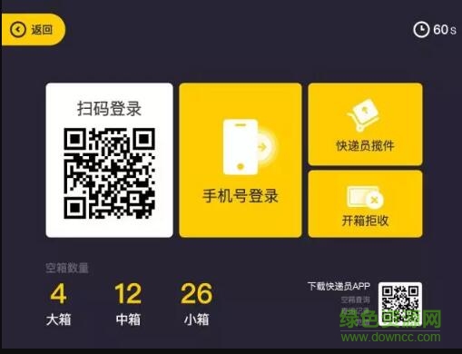1.在包裹柜前,點(diǎn)擊操作屏上顯示的“快遞員”菜單,進(jìn)入快遞員登錄界面,采取掃碼登錄或者手機(jī)號登錄等兩種不同方式登錄“中郵速遞易”智能包裹柜。